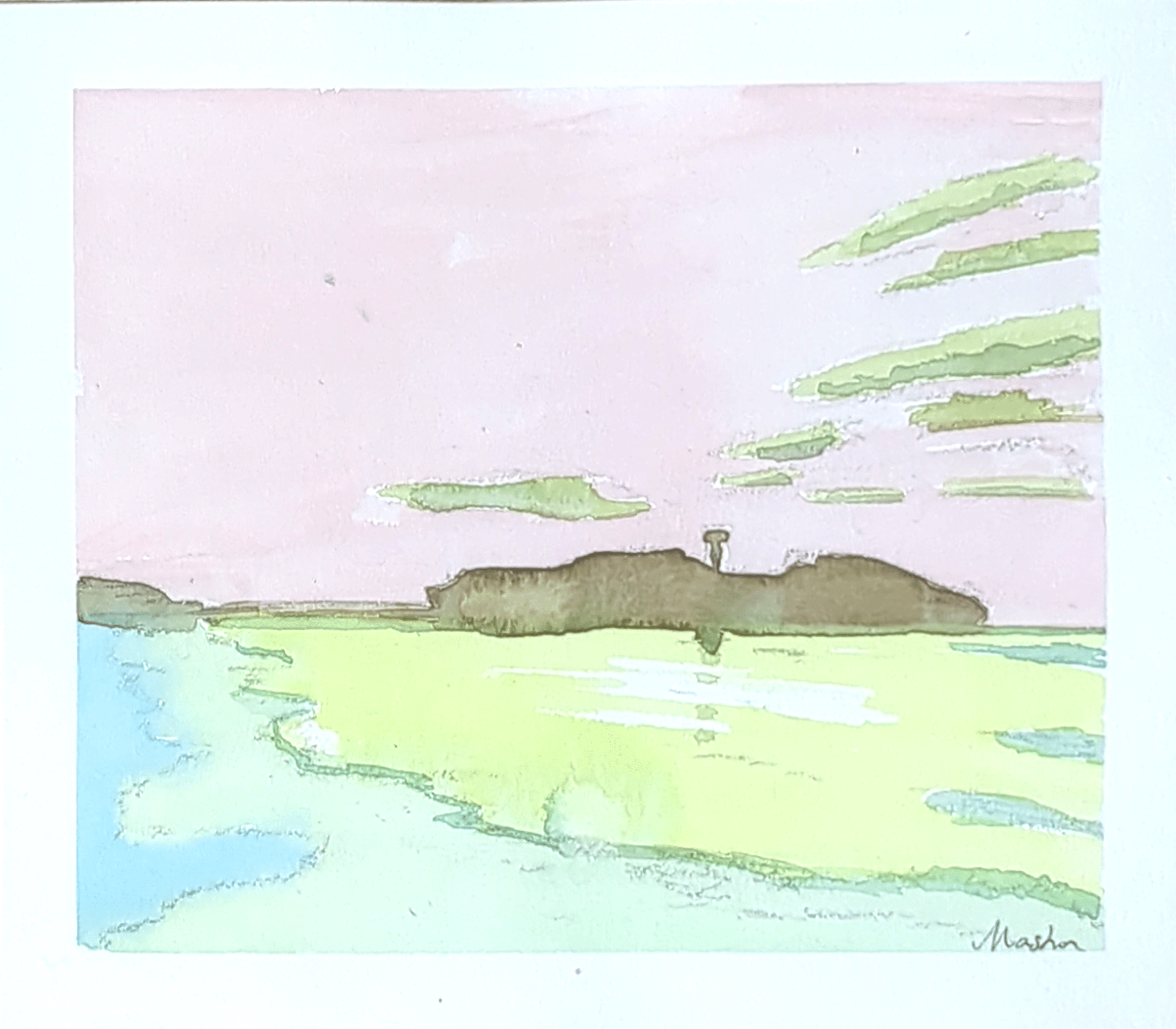 空のピンクは桜の色、江ノ島の影は木肌の色、海の緑は草原の色、砂浜の青はゆったりと流れる川の水面の色。