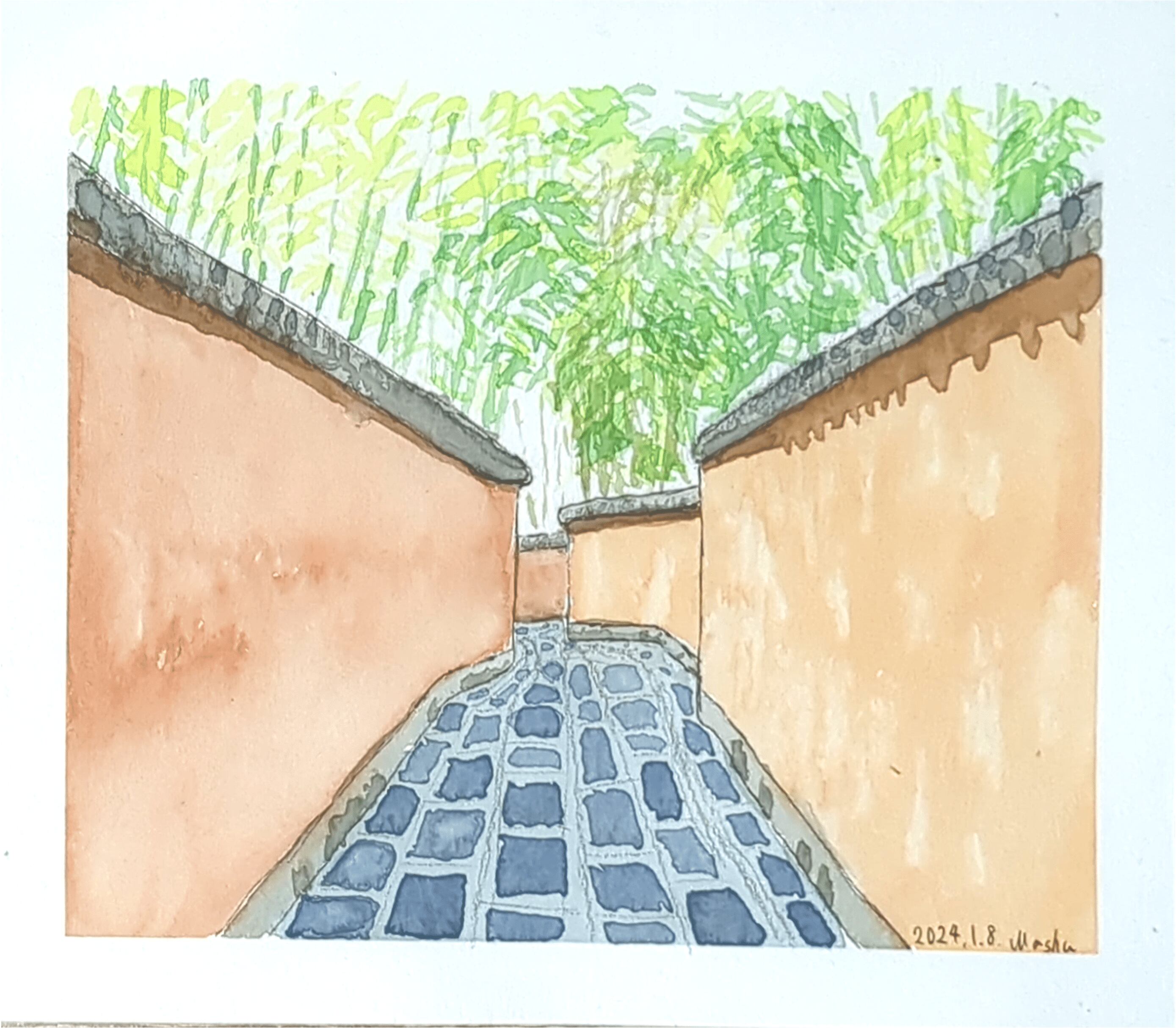 この道の向こうから、パンダがひょっこりと顔を出しそうな情緒のある昼の1ページです。