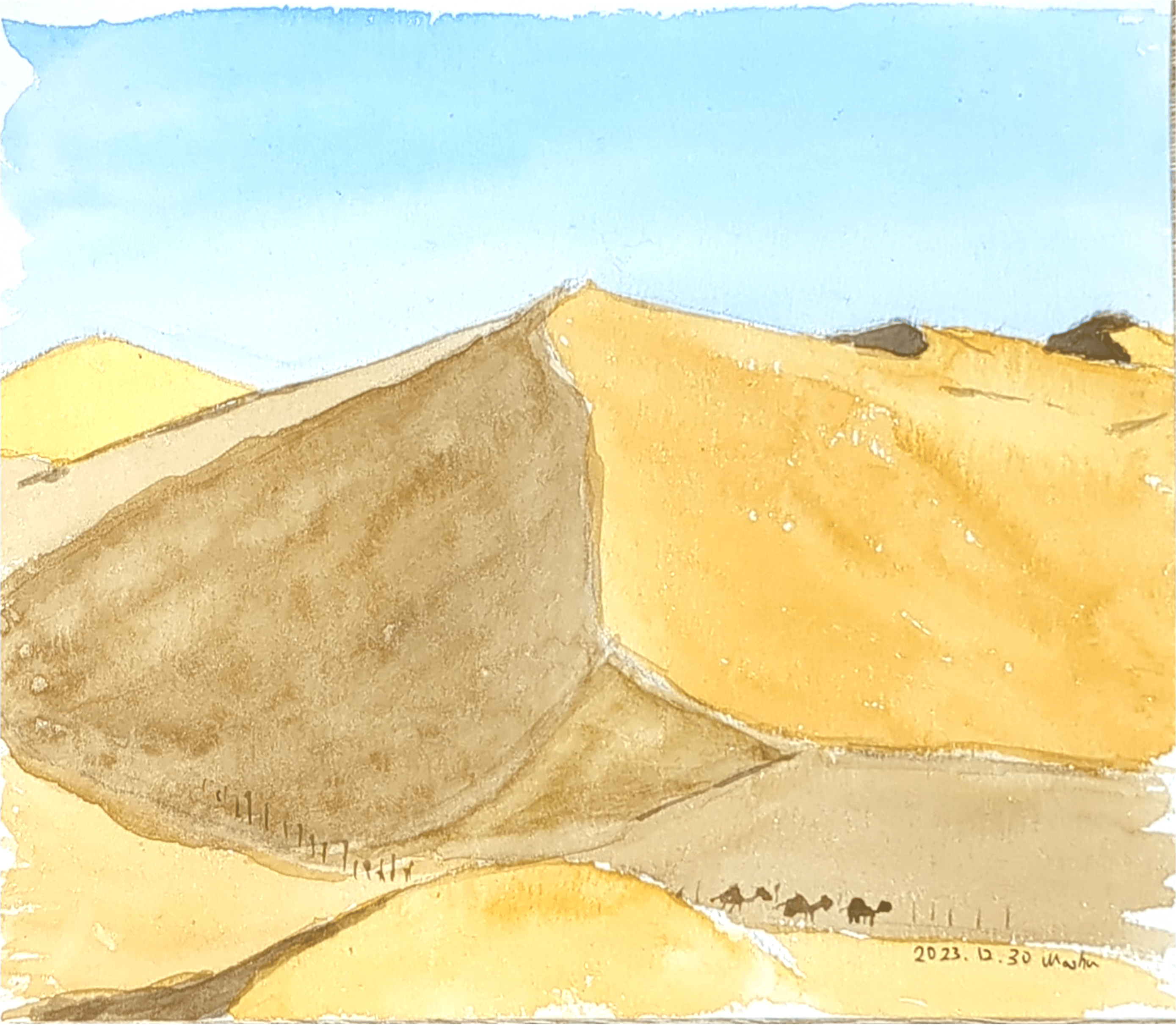 写真を撮影する際にちょうどラクダのキャラバンが通ったので、それも合わせて描いてみました。